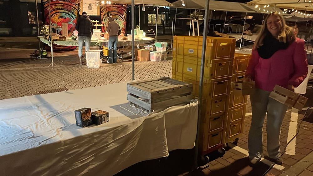 We zijn er klaar voor! De markt begon om 12 uur. Het was eigenlijk gelijk al best druk.