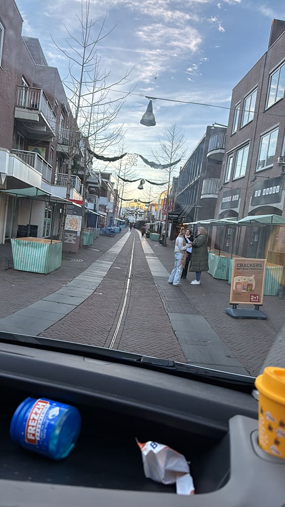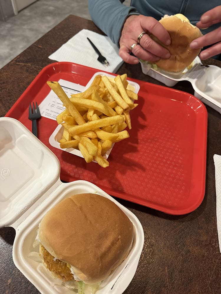Thijs was laat thuis en ik was nog druk bezig. Ik heb tussendoor even een patatje gehaald.