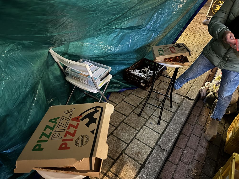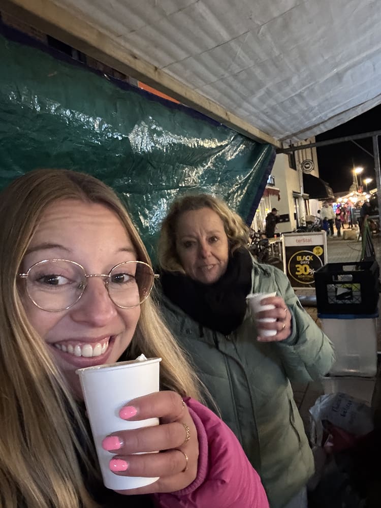 In de avond waren er echt amper mensen. Het was koud en geen klanten. Dat was minder… Wel kregen we gratis warme chocomelk. Dat was lief.