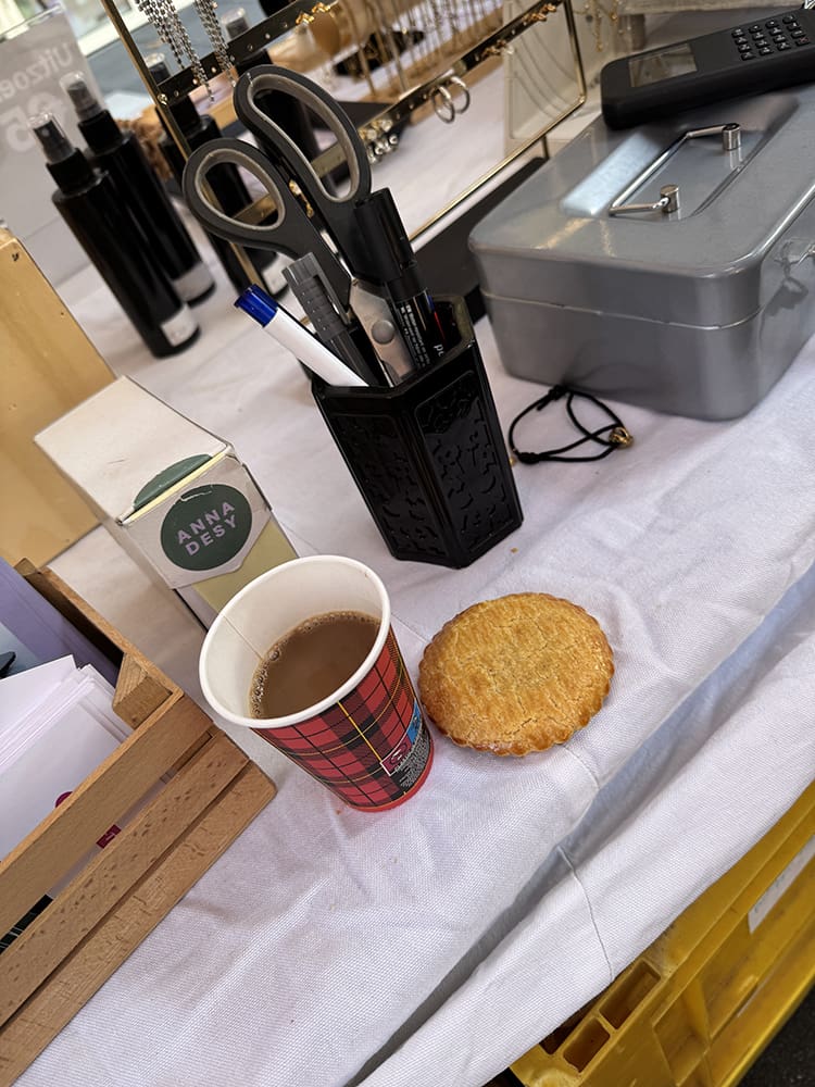 De kraam staat en tijd voor koffie. We kregen van de organisatie koffie en een koek. Super lief.