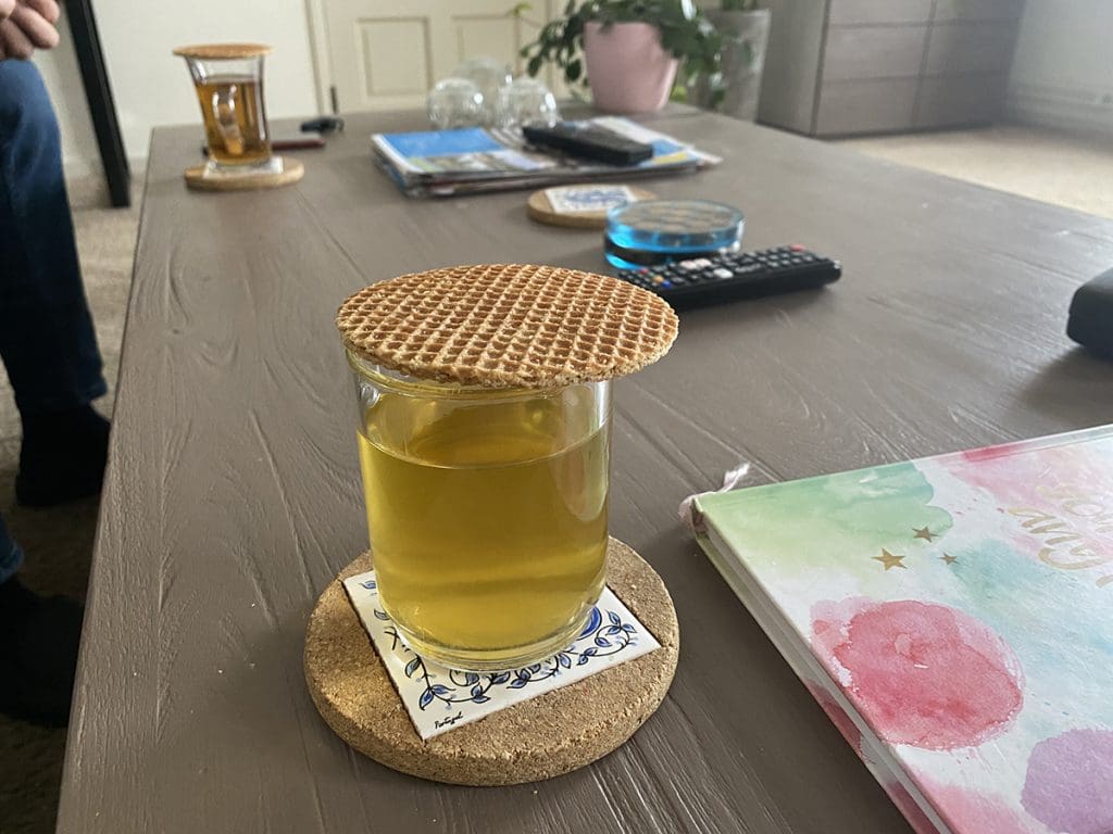 Zaterdag (13 februari). Die ochtend was het schoonmaak ochtend. Tussendoor even koffie drinken met Thijs.