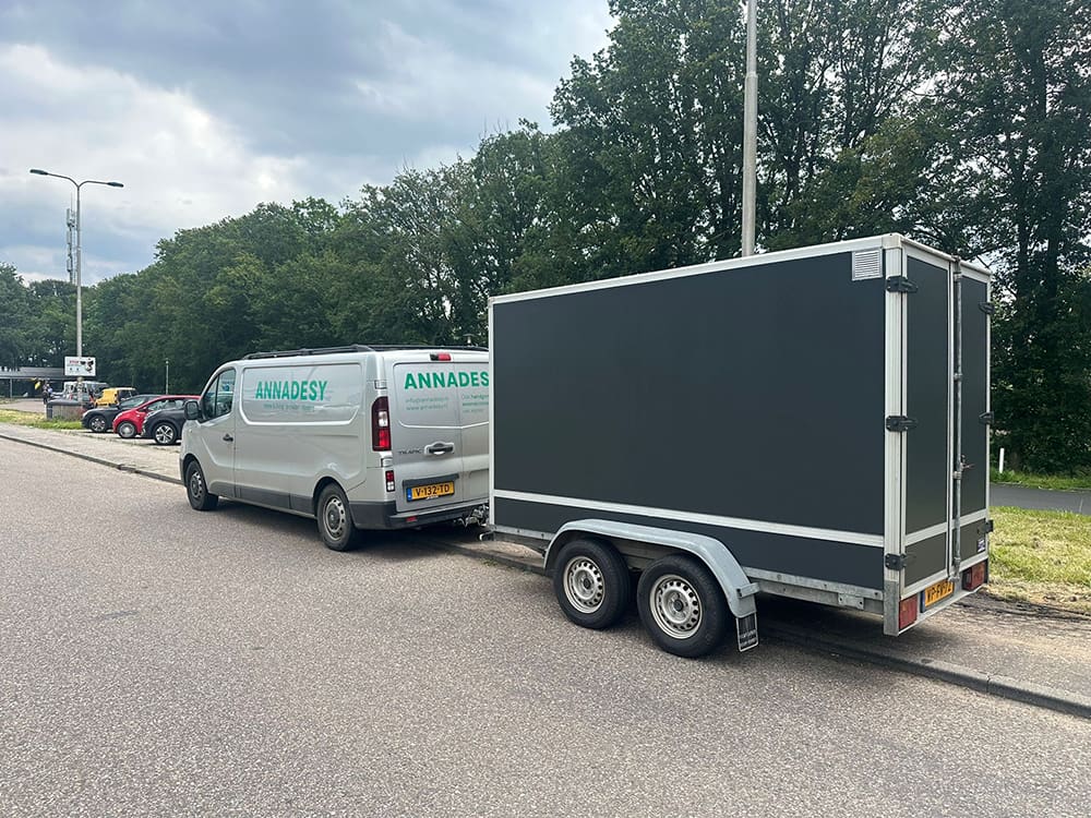 Thijs had die middag een aanhanger opgehaald via Marktplaats. Wanneer er nog meer mee gaat van Snoepbaas en ANNADESY naar markten kan dit in de aanhanger.