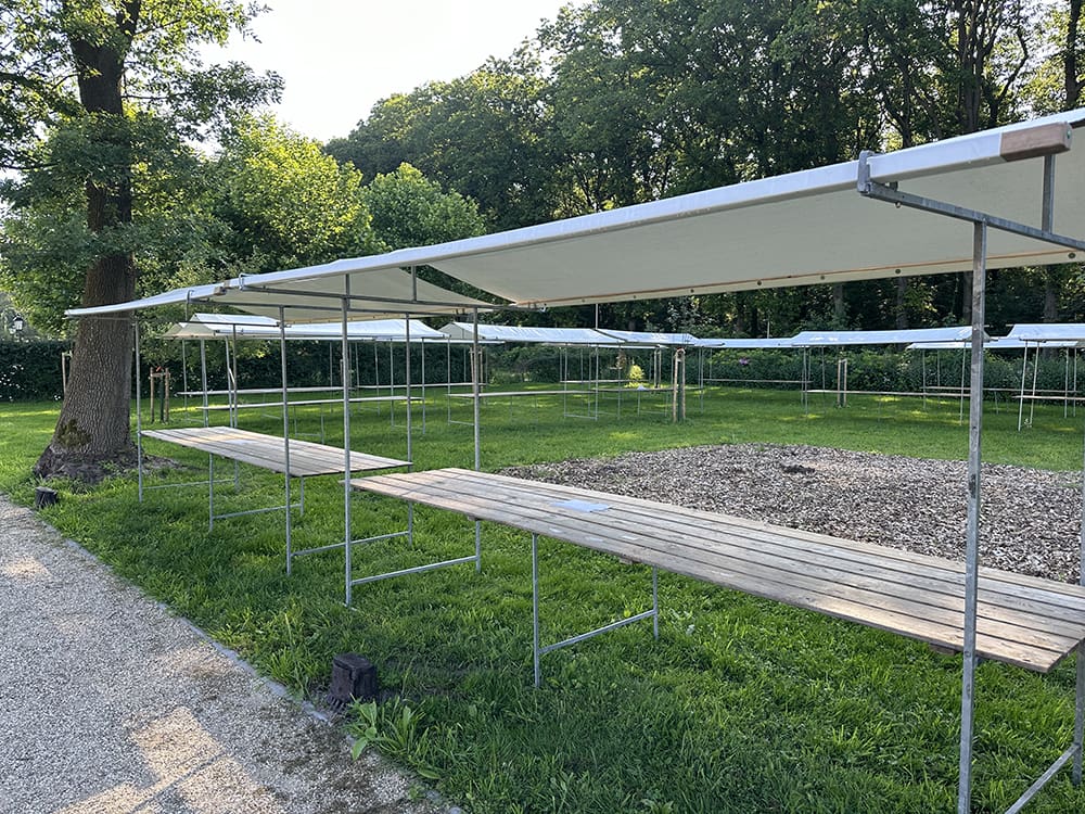 Danielle kwam helpen met opbouwen. Het waaide alleen erg hard die dag. Haar jurkje waaide de hele tijd omhoog. Ze heeft er knijpers aangehangen. Ik lach helemaal in een deuk.