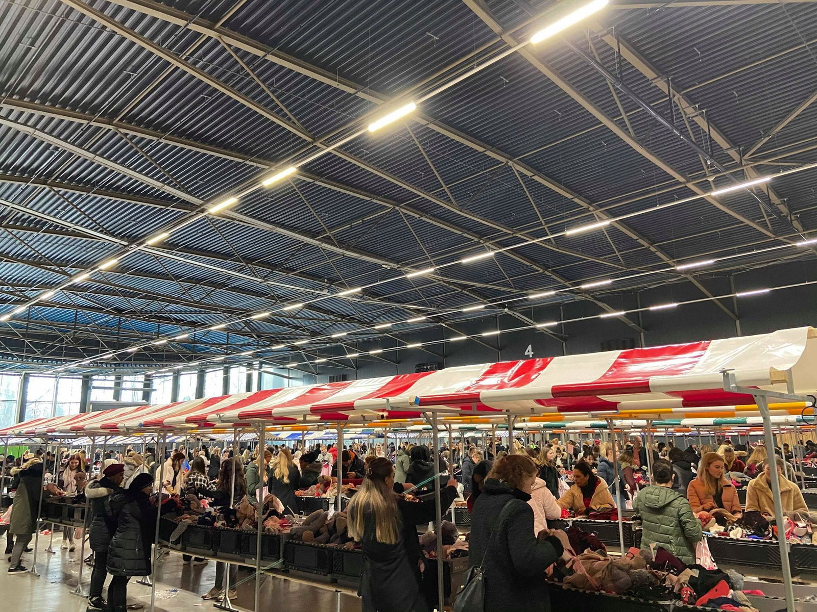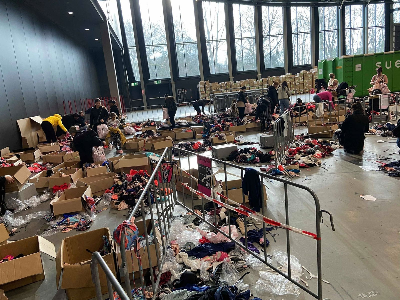 Daarna liepen we naar de andere hal. Hier hingen meer dingen op een rekje, maar ook hier veel dozen met van alles door elkaar erin.
