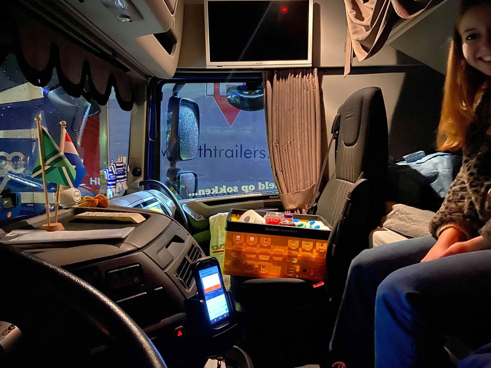 Daarna reden we naar het werk van Thijs. Hij rijdt een week lang internationaal. Dat betekend: ook slapen in de vrachtwagen. We brachten vast een dekbed en wat eten naar de wagen. Kijk nou wat gezellig?!