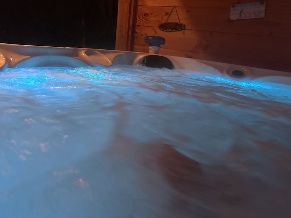 Met Thijs na het eten lekker in de warme jacuzzi.