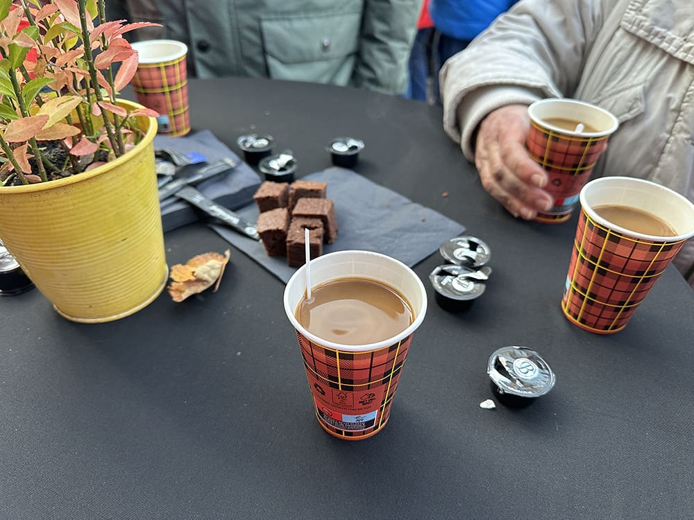 Terwijl de lopers van start gingen, hebben wij ons opgewarmd met koffie.