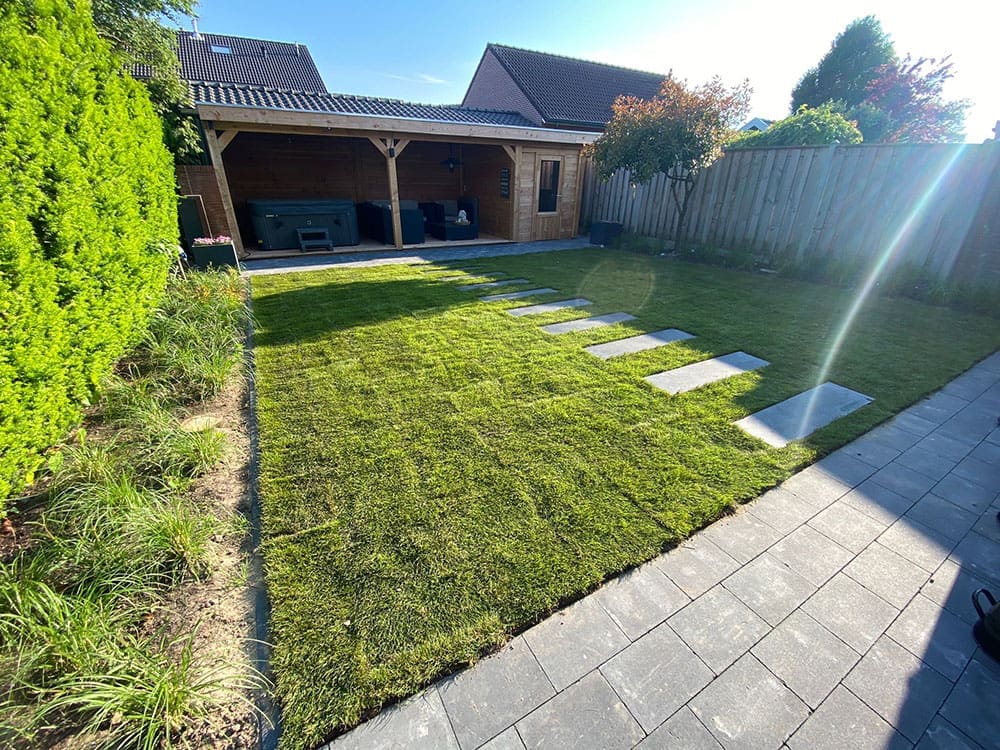 Thijs stuurde ondertussen deze foto door. De tuinman heeft onze grasmatten erin gelegd. Wauw, zo mooi!