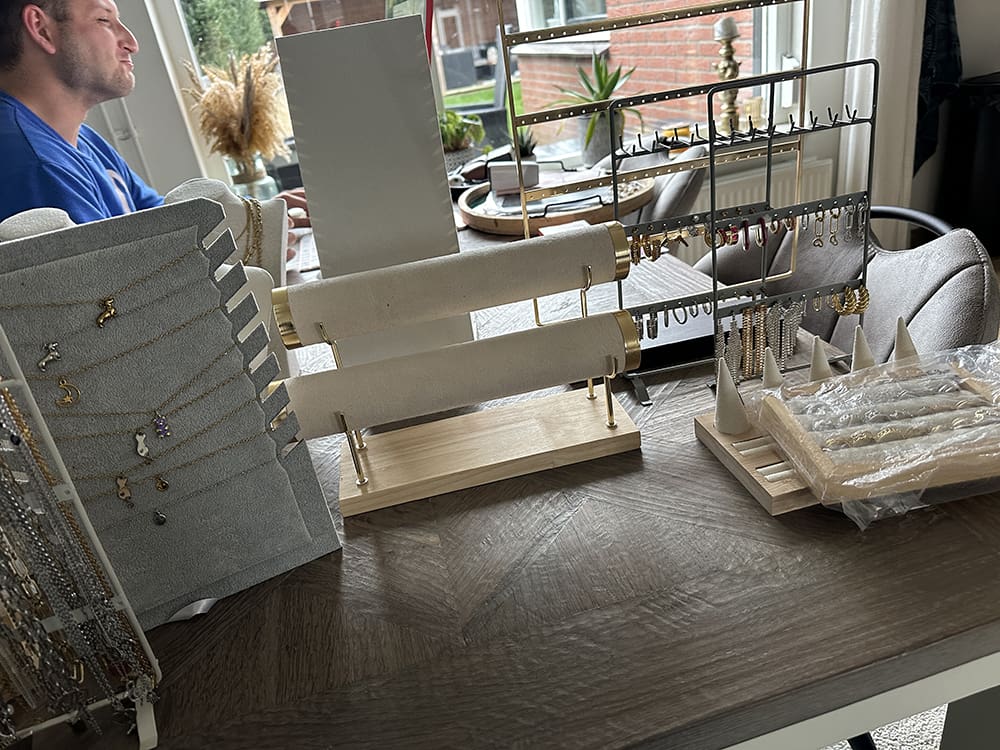 Thijs was ook gezellig thuis. Hij bezig achter de computer en ik ging onze sieraden voor de markt ordenen.
