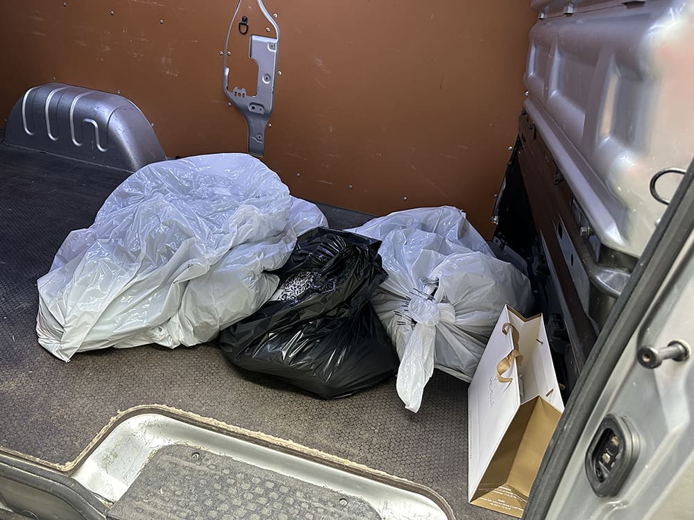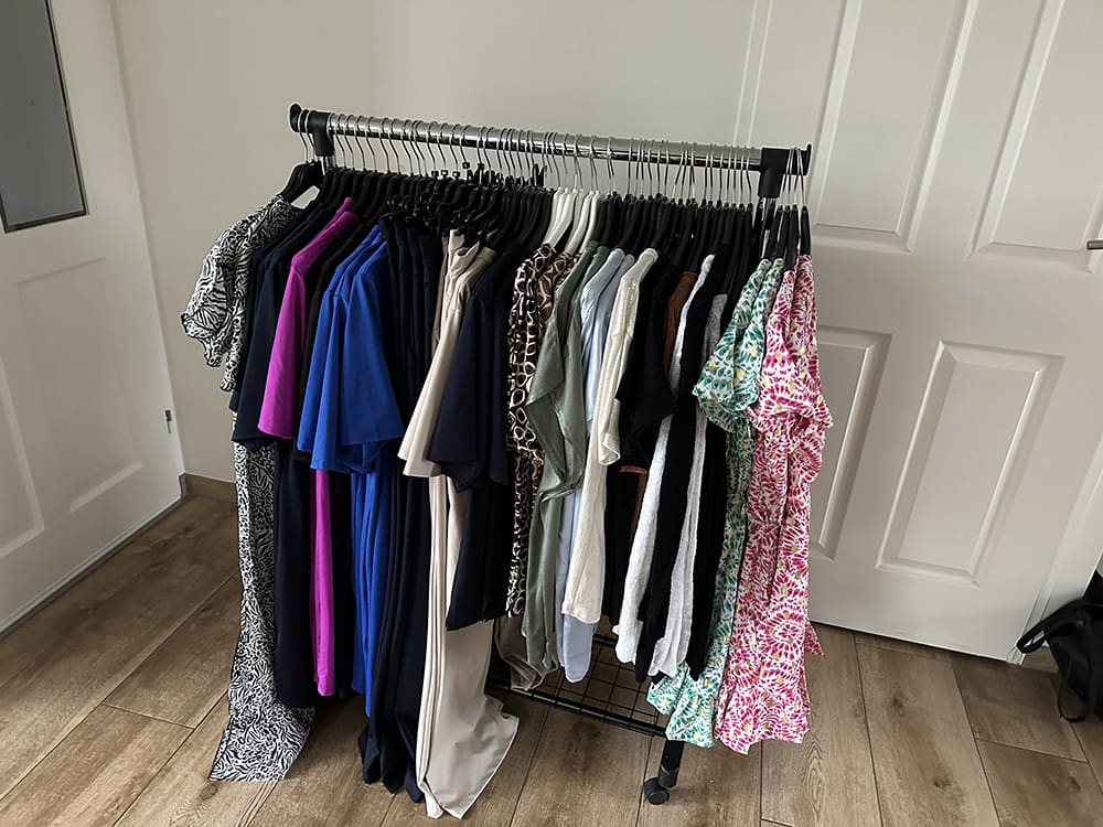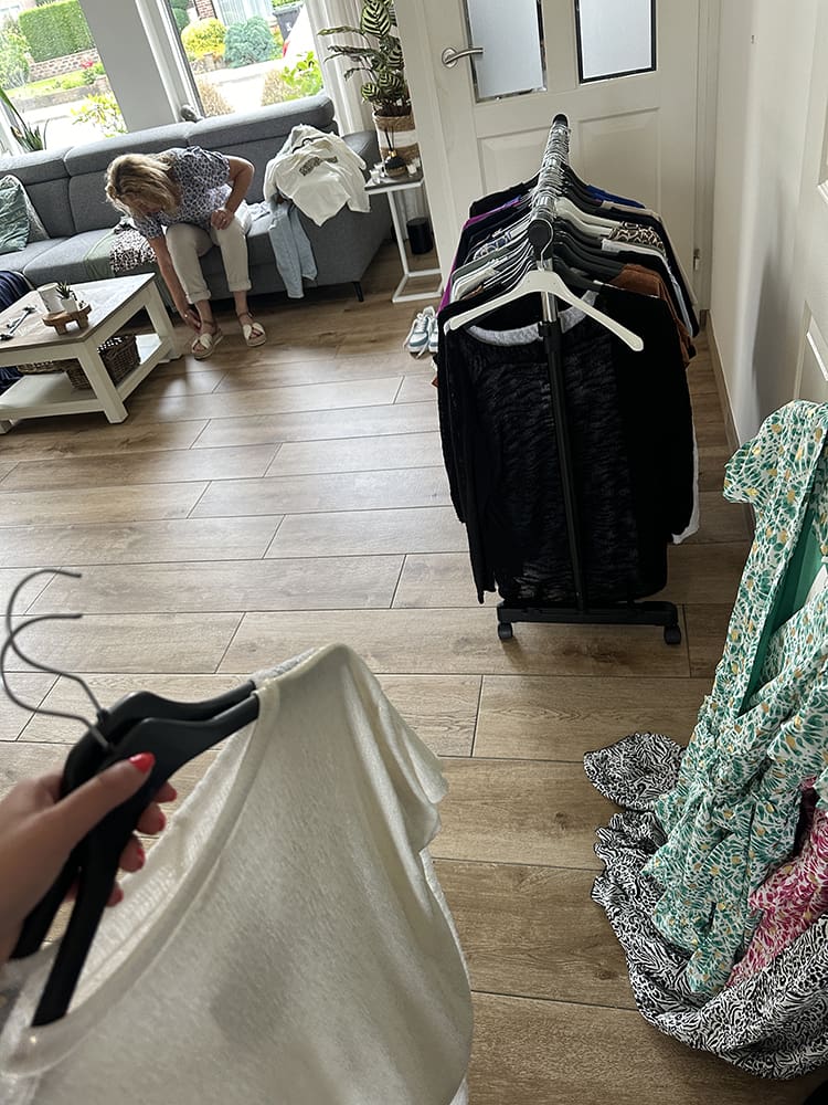 Eenmaal thuis heb ik de kleding uithangen. Er hangt altijd een geurtje aan vind ik. Kan het even uithangen. Niet alles paste op het rekje, haha. De bank lag ook vol.