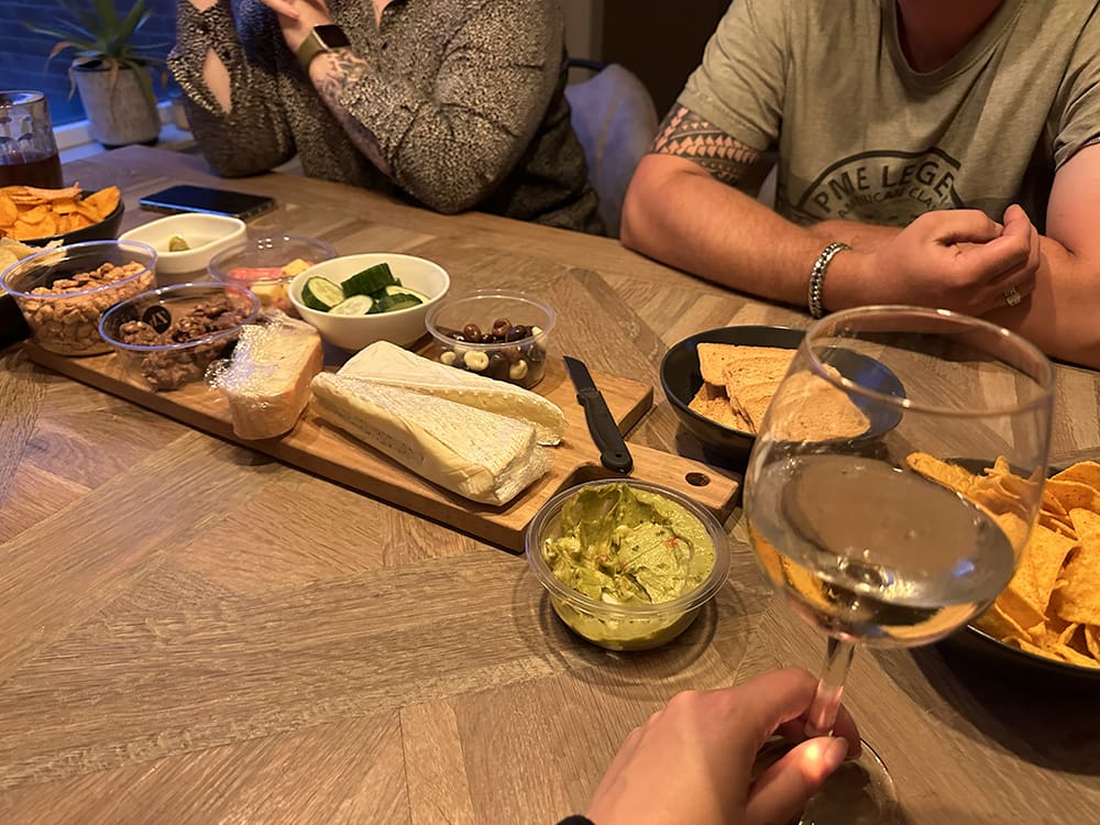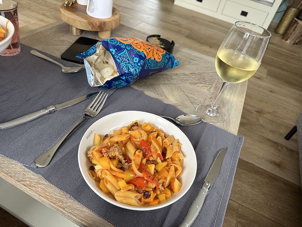 Ondertussen had Thijs lekker gekookt. Ik heb die dag een belangrijke beslissing gemaakt/besproken wat betreft werk. Dit moest een beetje gevierd worden, vandaar het wijntje.
