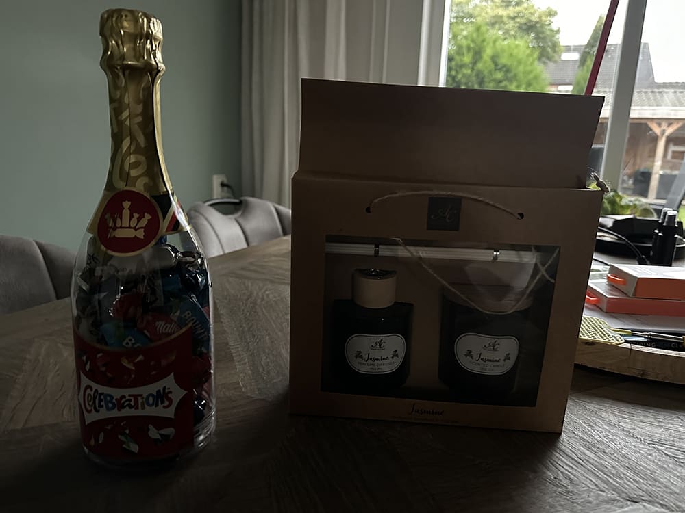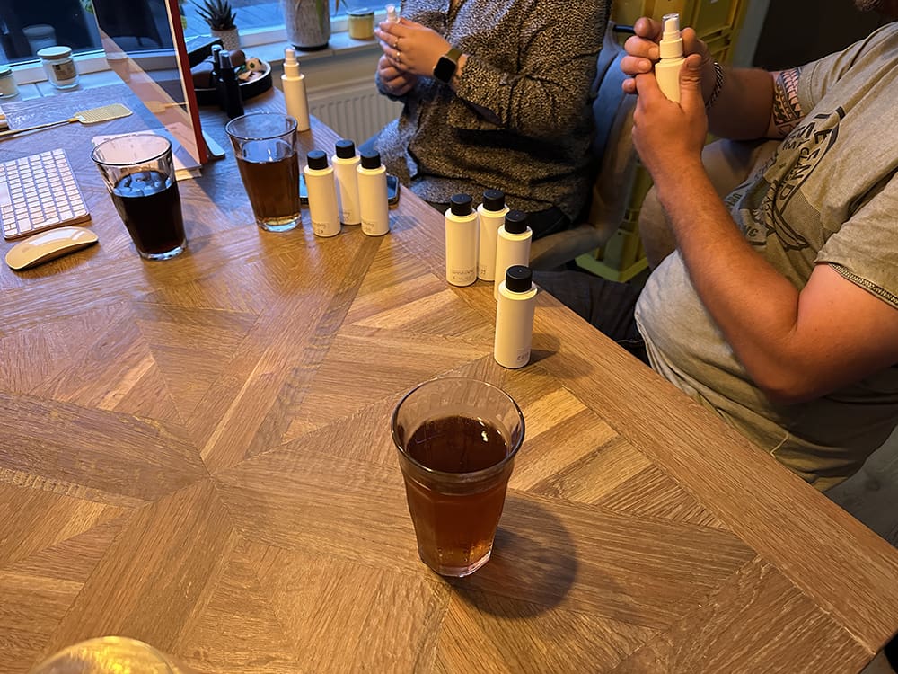 Eenmaal thuis kwamen Chelsey en Jouke op bezoek. Ze wilden een roomspray voor in huis. Zo veel rook zo lekker. Ze hebben er meerdere meegenomen, haha.