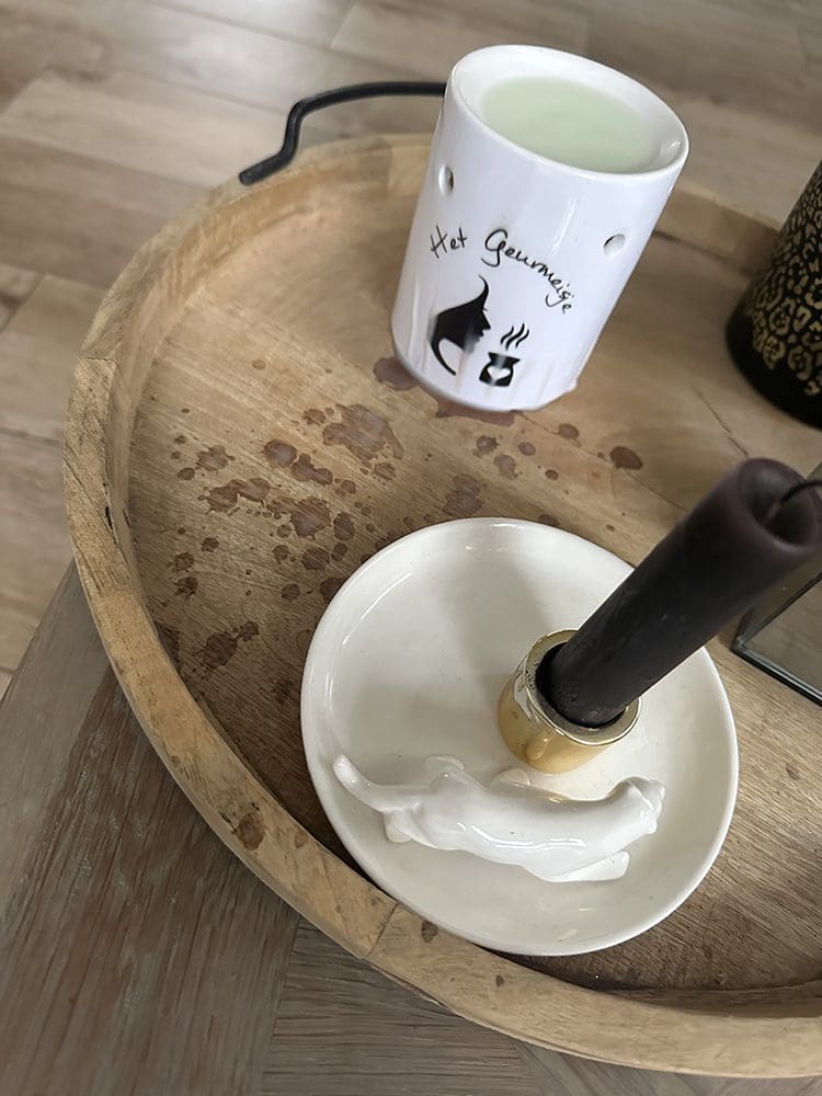Vrijdag (1 september). Ik kwam in de ochtend beneden en zag ik gisteravond iets te enthousiast een kaarsje heb uitgeblazen. De gesmolten wax is eraf gevlogen. In de middag heb ik het huis schoongemaakt en helaas kreeg ik het er niet meer vanaf…