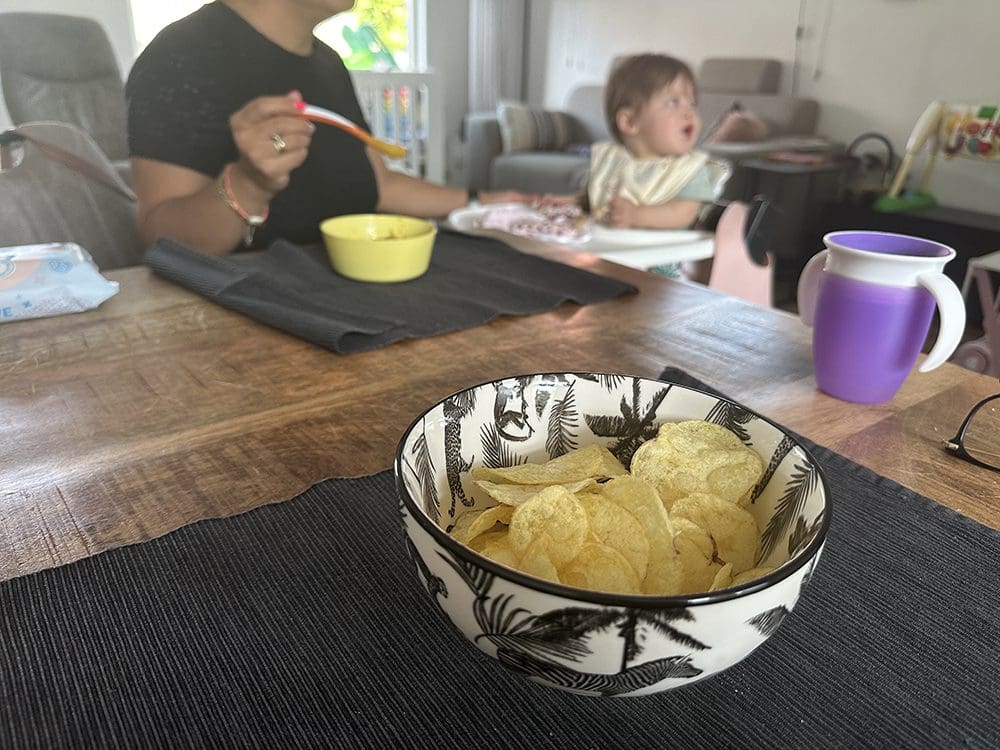 Sylvie moest een hapje eten en mama en ik ook: chippies, haha.