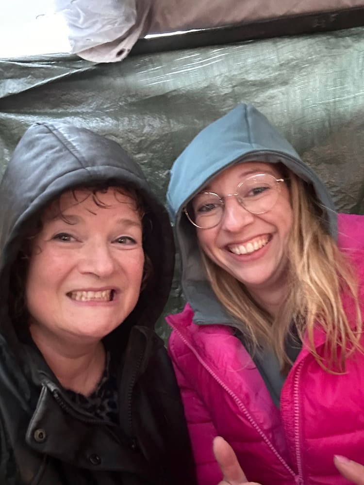 Zelf al helemaal nat geregend… We zijn zeker een uur ermee bezig geweest. Met hulp van onze buurman is alles gelukt.