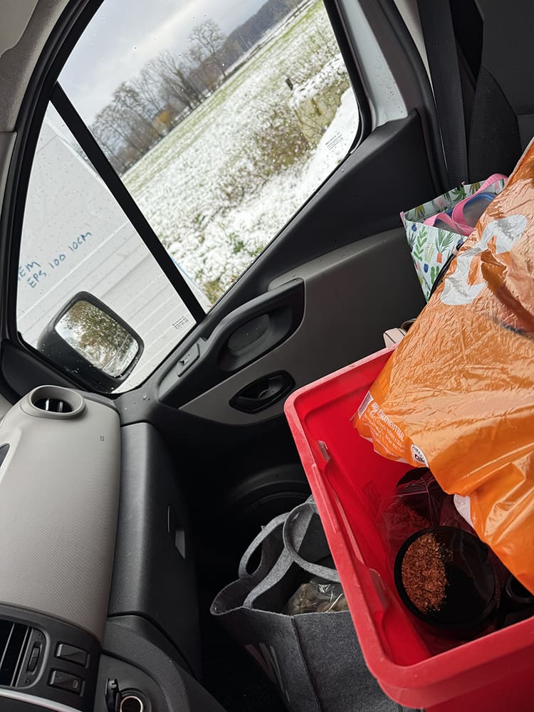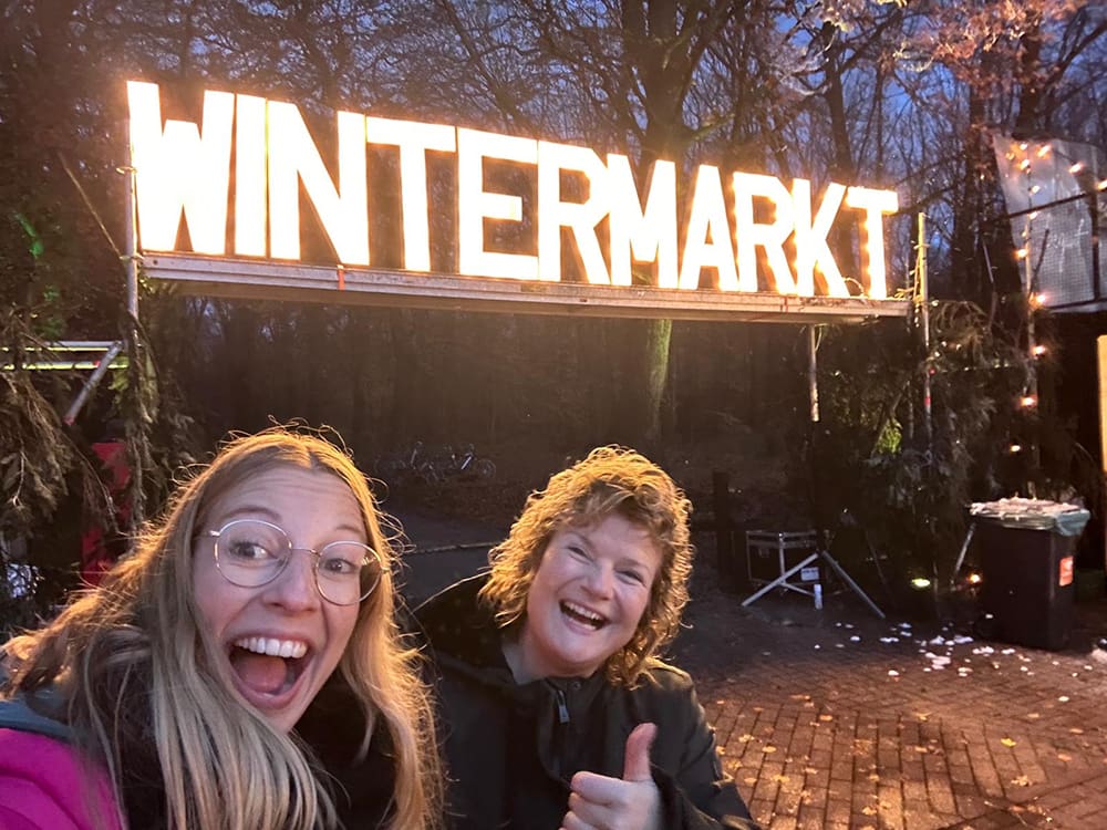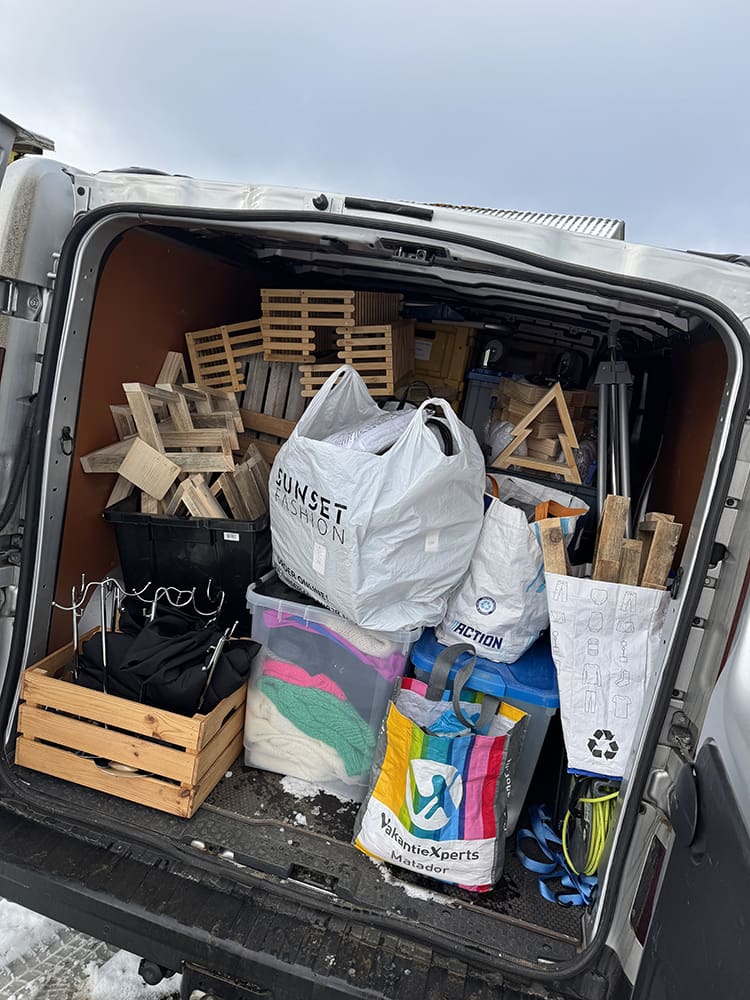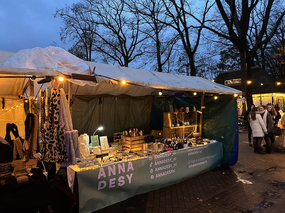 Met hulp van haar man Bart hebben we de bus een beetje opnieuw ingepakt zodat ook de tassen en kerstbomen van hout van Leandra erbij in kunnen. We gaan samen naar de Wintermarkt in Uddel.