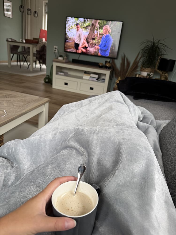 Met een dekentje, wijntje en het Jachtseizoen op de bank.