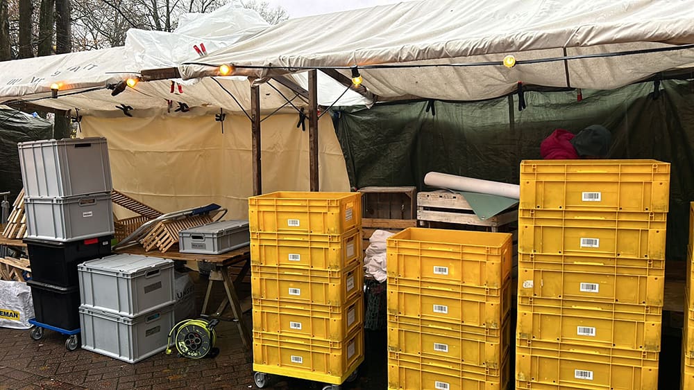 Het regende alleen die middag. En het hield niet op. We hebben eerst een hele tent om onze kramen gebouwd zodat we droog staan.