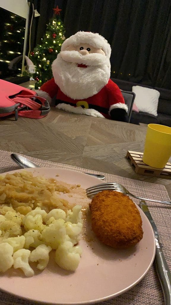 Maandag (7 december). Een langere dag op school. Ik heb een hele dag in dezelfde klas gestaan. Eén collega is nog niet beter en ik die op maandag, dinsdag en woensdag deze groep nu. Leuk om dit weer eens te doen. Het is een gezellig clubje kinderen. Tot en met de kerstvakantie en één week daarna ga ik dit nog doen. De donderdag en vrijdag ben ik dan vrij. Dan klopt het ook met mijn aantal uren. Toen ik thuis kwam eten maken en bij gebrek aan je vriend….. Dan zet je je nieuwe kerstman toch tegenover je, haha.