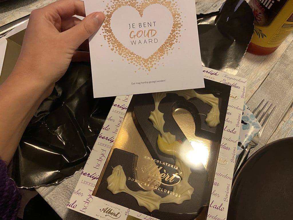 Onze boodschappen werden ondertussen ook gebracht. Deze kregen van de Sint. Dat wordt voor de dames hun toetje. Rond half 7 ging de bel weer ineens. Ik dacht nog: kan Thijs niet zijn. Die heeft toch gewoon een sleutel?! Ik deed open…..