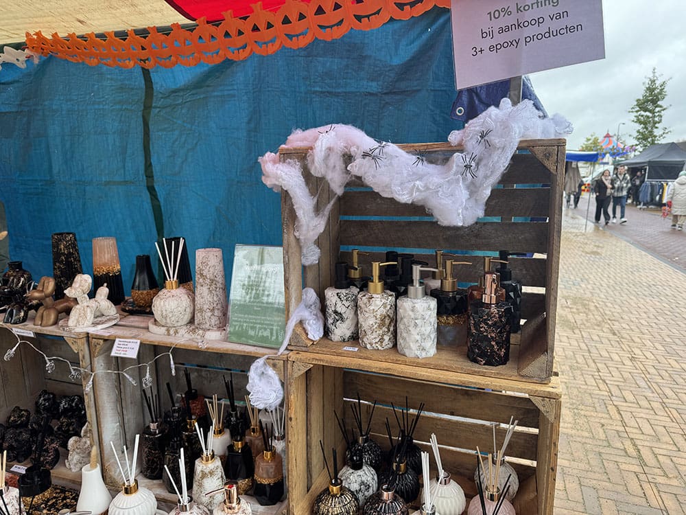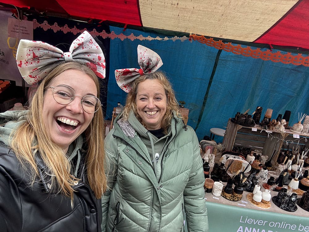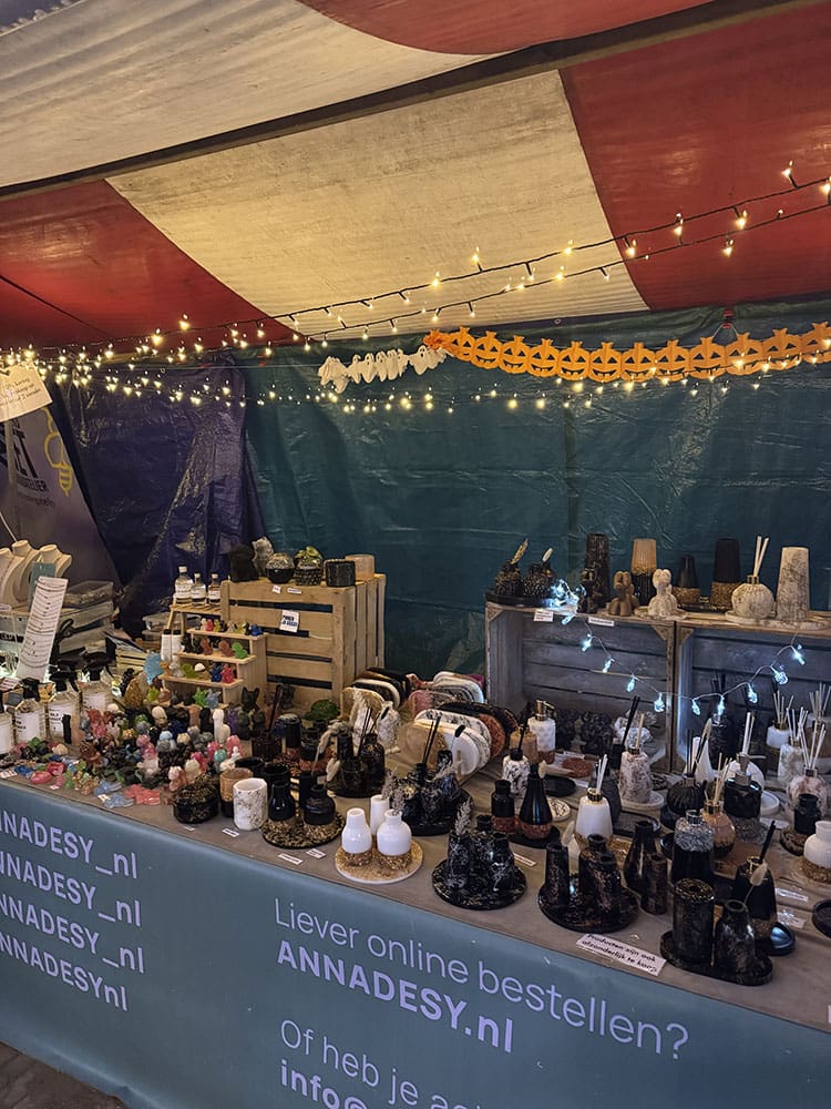 We hadden de kraam een beetje in Halloween thema gemaakt. En belangrijk: alles vastgezet voor de wind en een zeil voor de regen.