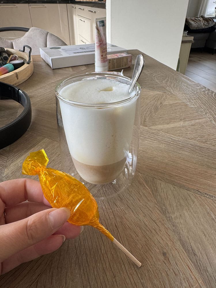 Zondag (26 oktober). Ik sliep lekker uit en heb in huis gerommeld. De was en achter de laptop wat gedaan. We namen koffie met een lekkere honinglolly. Ook op de markt gekocht.