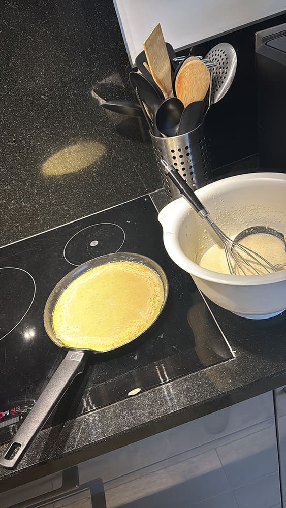 Eenaal weer thuis gingen we pannenkoeken bakken, lekker.