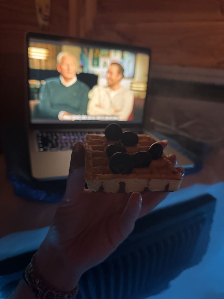En nog even lekker in de jacuzzi met een wafel met fruit. We keken de Verhulsjes, zo grappig.