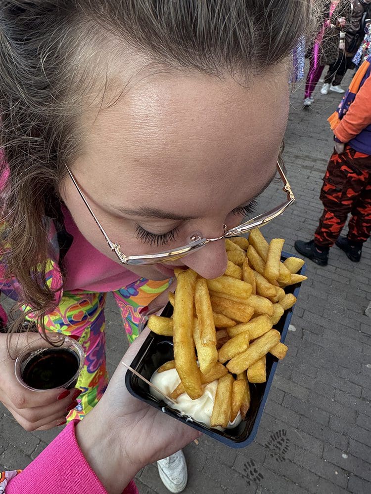 Uhm tja… Jolynn eet friet zonder handen.