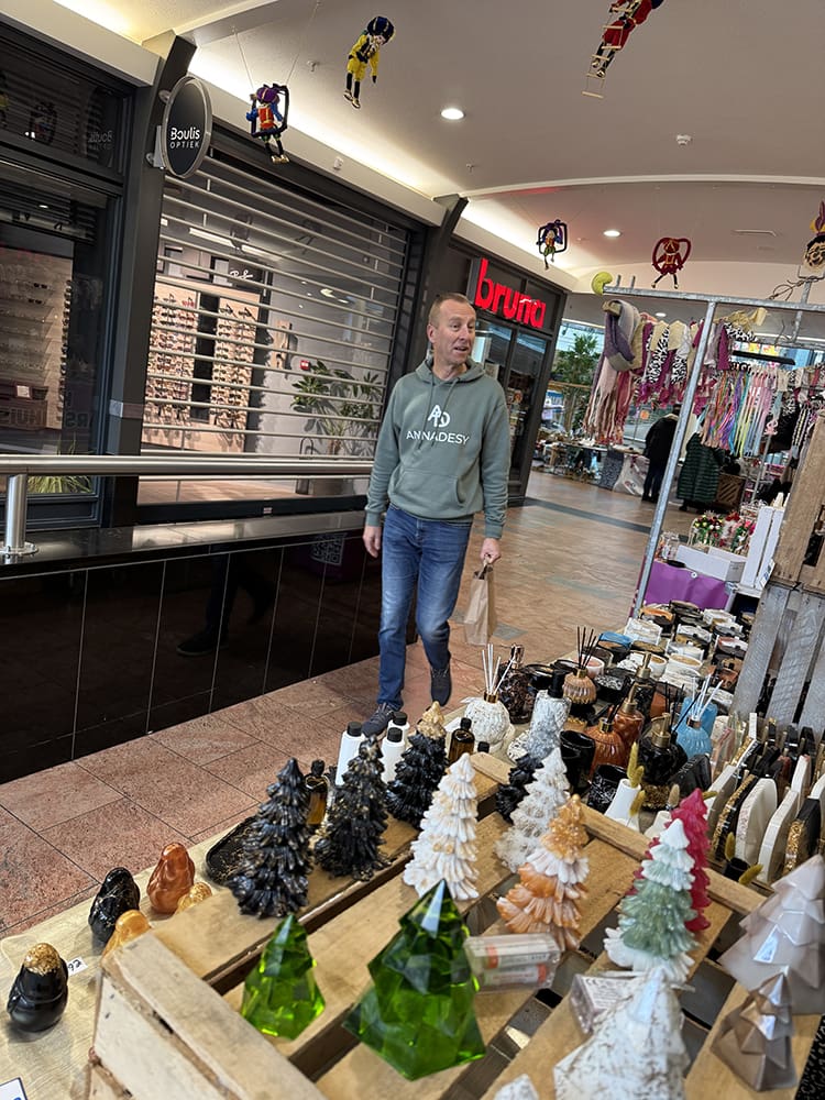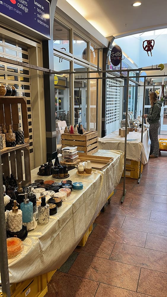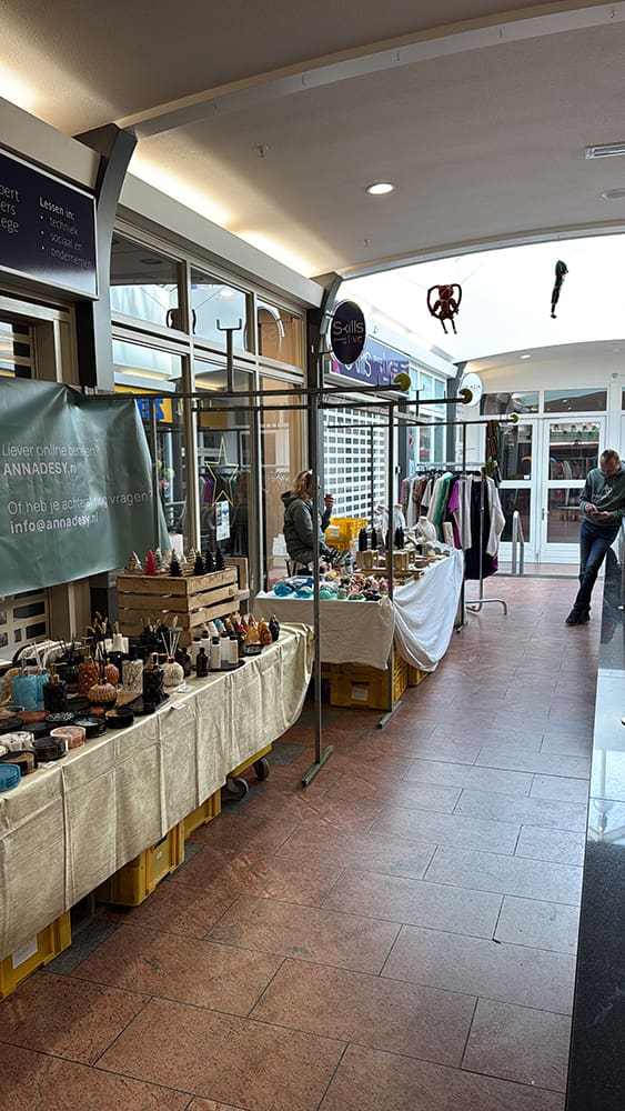 Daar hadden we een markt in een winkelcentrum. We waren mooi op tijd en konden rustig opbouwen.