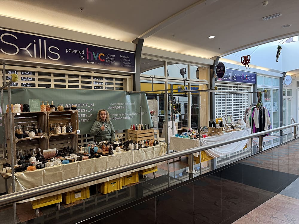 We staan! Wel in een rare uithoek. We keken uit op het middenstuk van het winkelcentrum waar allemaal kraampjes in een rondje stonden. Wij stonden in een soort zijstuk met nog twee andere. Heel raar.