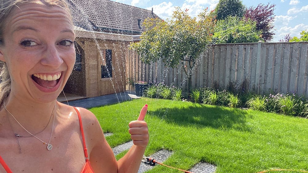 Wat verkoeling zoeken onder de sproeier.
