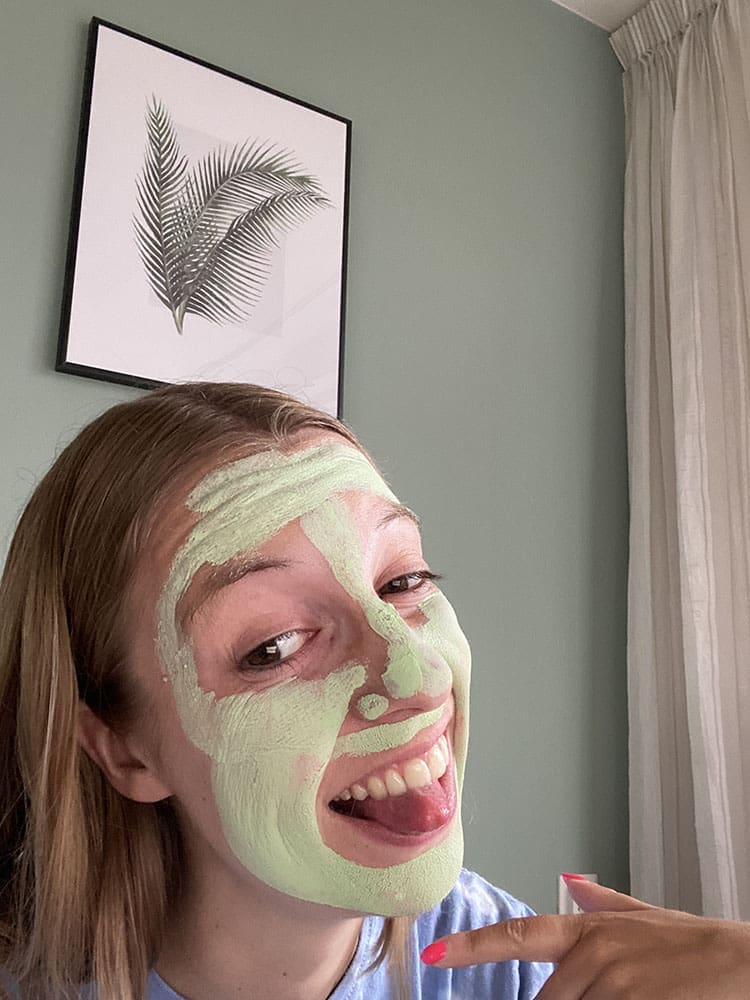 Dinsdag (21 juni). Ik werkte de hele dag op school. Na het eten bracht ik een maskertje aan die ik aan het testen ben. Haha, heerlijk hoor.