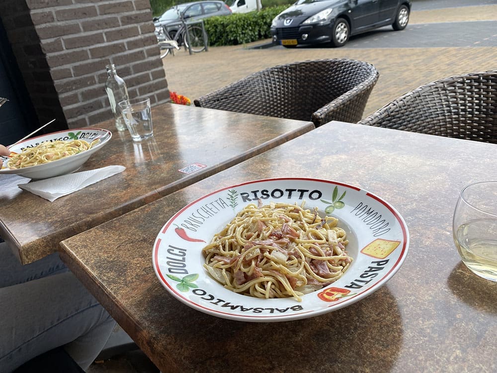 Het was alweer etenstijd en aangezien Thijs laat was en mijn vader een BBQ had, zijn we een pasta gaan eten buiten de deur. Konden we gelijk wat dingen overleggen.