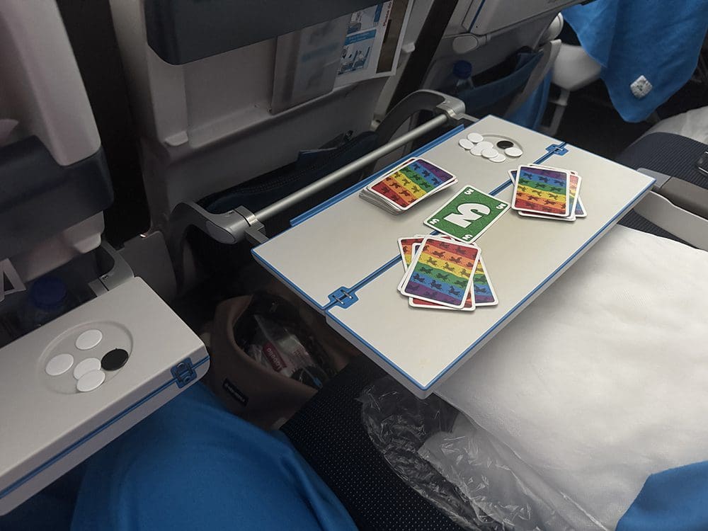 We konden rond half 10 boarden. Het vliegtuig zat niet helemaal vol. Tussen ons in konden we een stoel vrijhouden. Super chill.