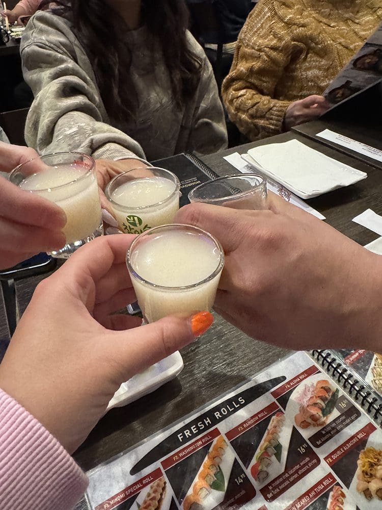 En daarna zijn we gaan eten bij een Sushi restaurant. Nadia en haar vriend waren er ook. Cheers! Een soort rijstwijn shotjes. Lekker!