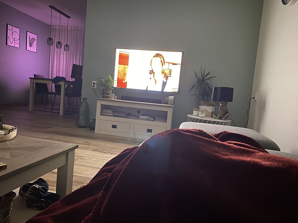 Na het eten keek ik met Thijs een serie op de bank.