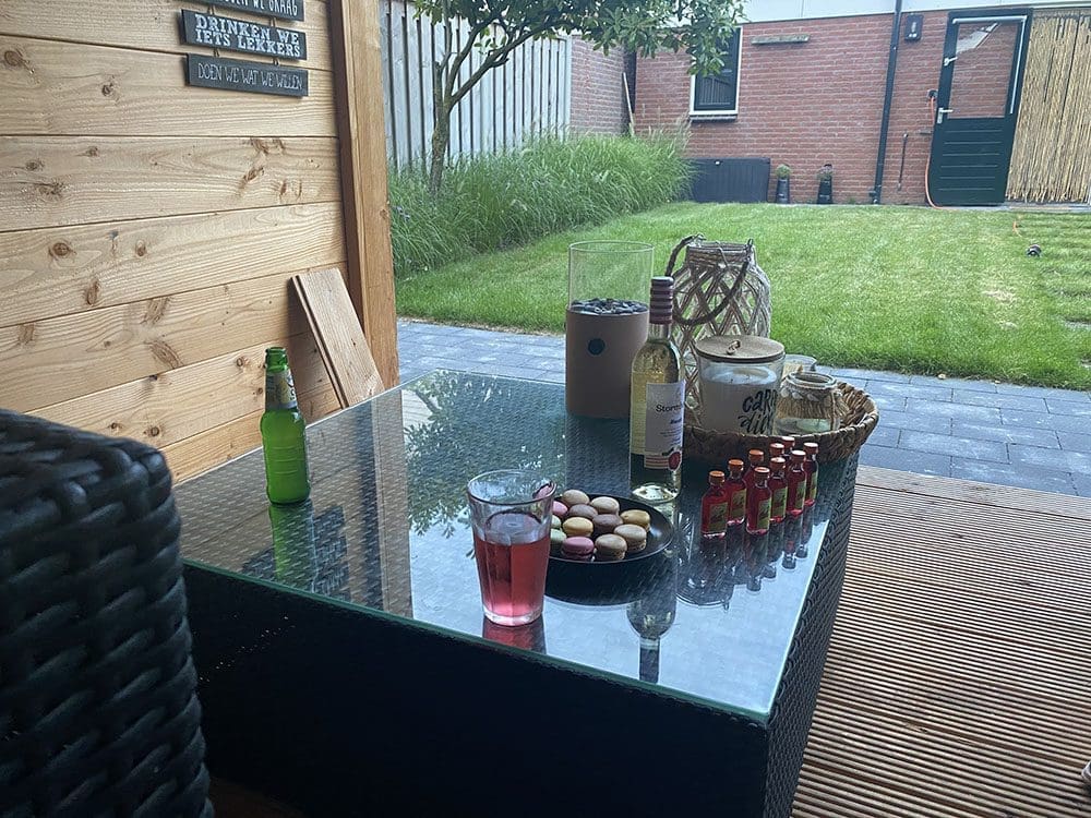 Ik had in de stad de dag ervoor nog gezellige lampjes gekocht. Dacht: leuk voor in de boom. Maar ik weet het niet zo. Heb wel de avond lekker buiten gezeten.
