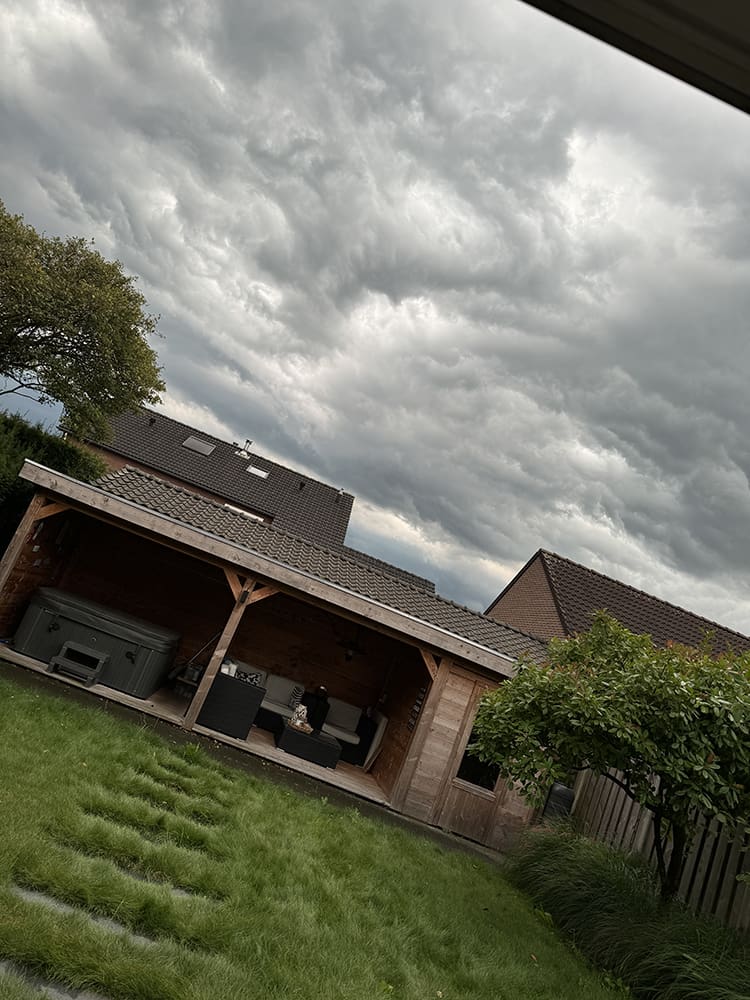 Na het eten wilde ik buiten zitten. Dat ging even totdat deze dreigende lucht eraan kwam. Het begon ineens heel hard te waaien. De regen en onweer vielen mee erna.