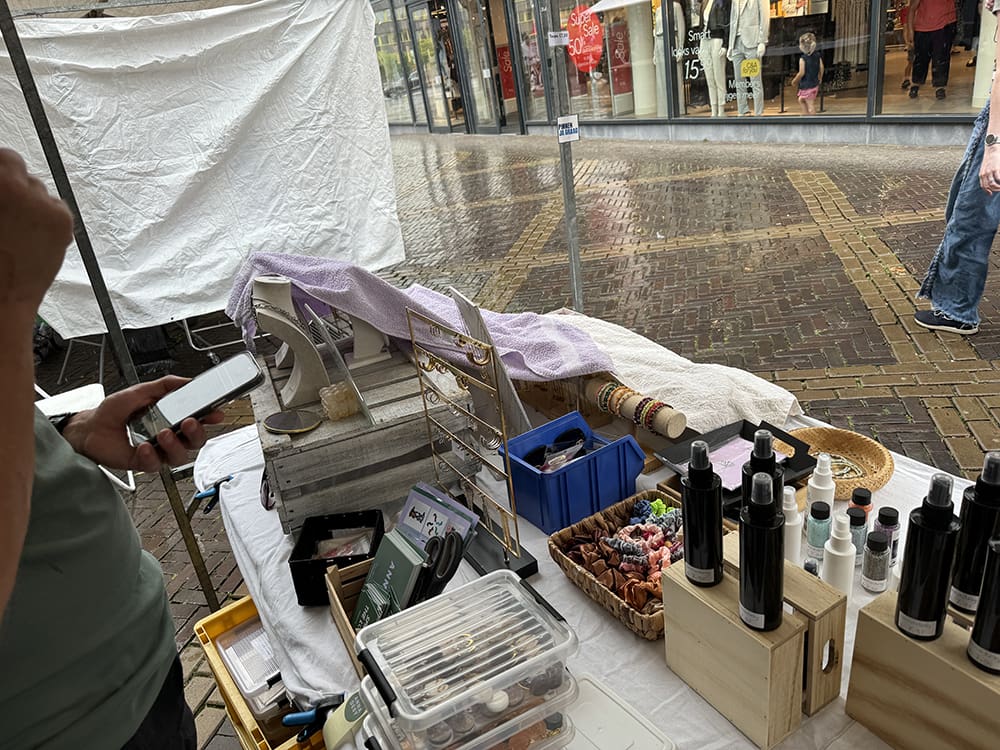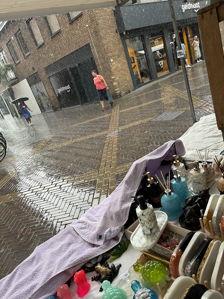 Totdat er plots regen kwam…. Snel een zeil om de kraam heen en wat dingen afdekken.