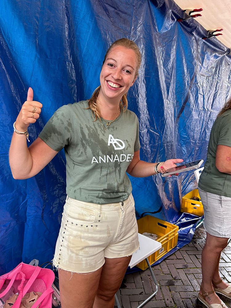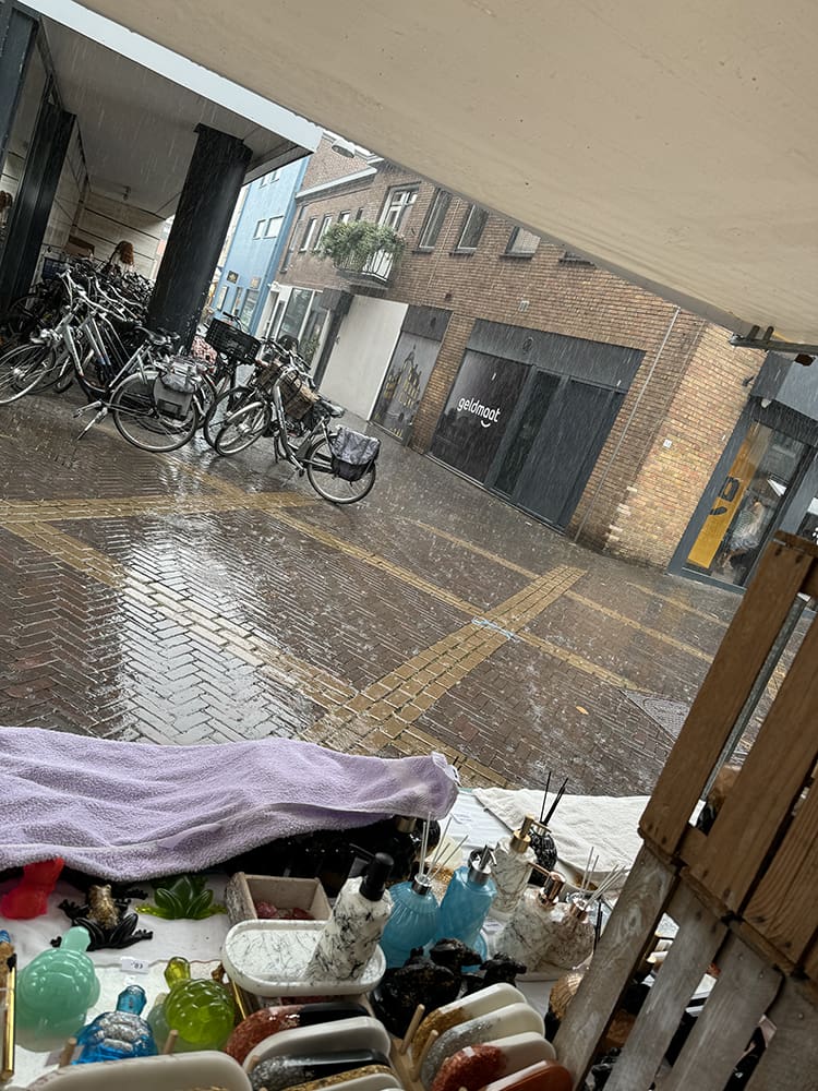 Dat kon ons dakje van de kraam niet helemaal aan. Er stond een hoop water in, dat heb ik eraf geduwd zoals je ziet, haha. Alles was nat.