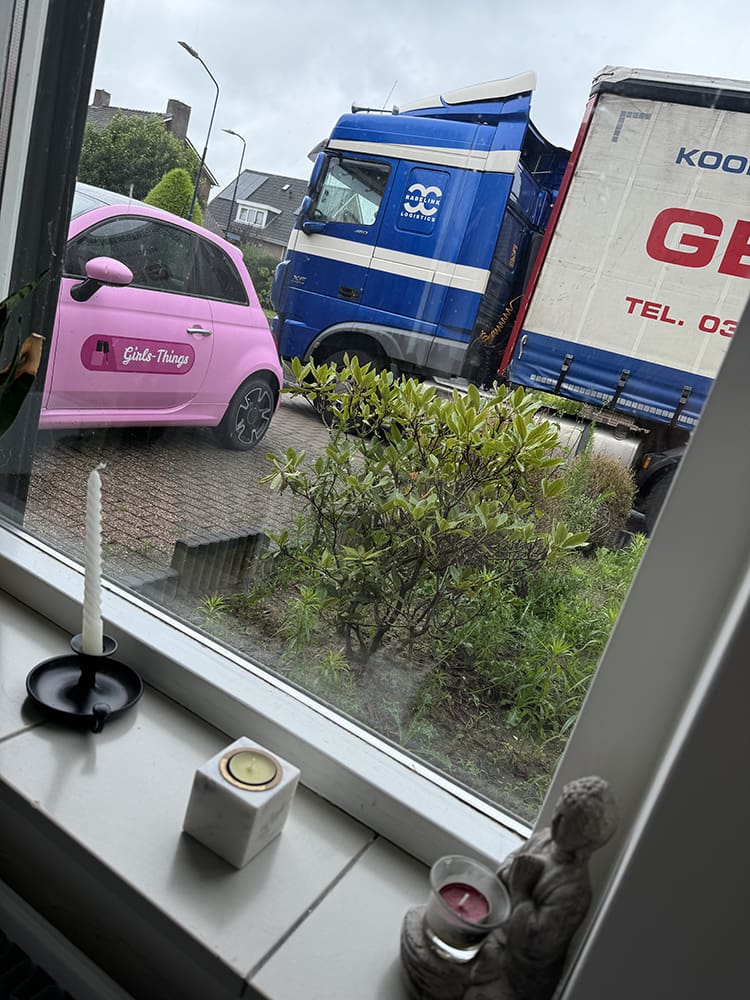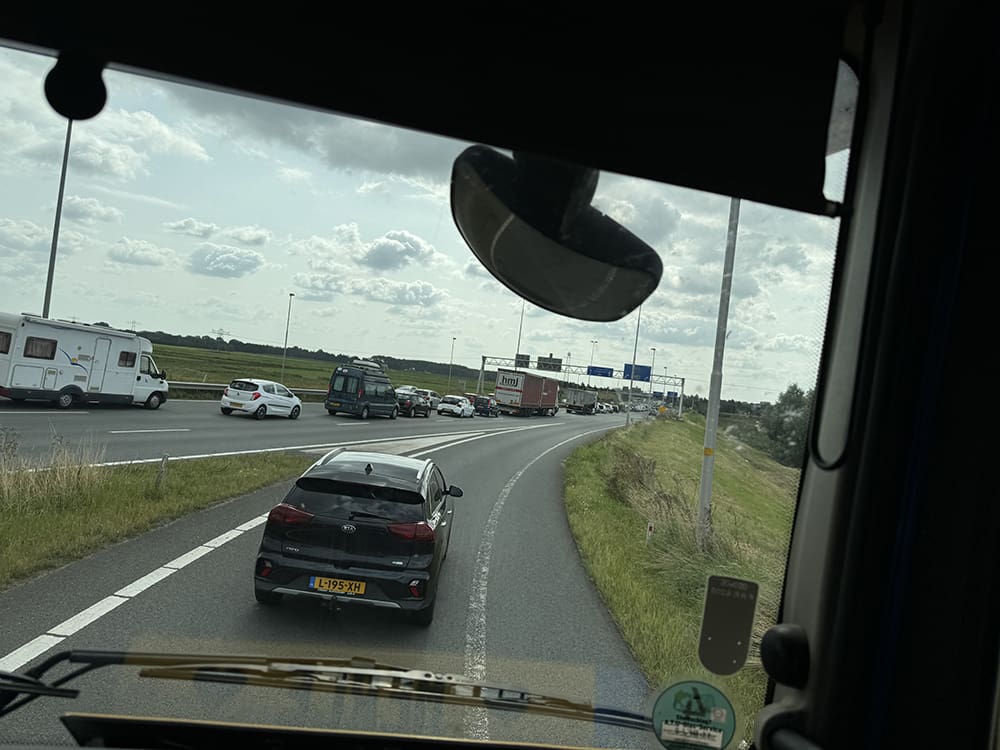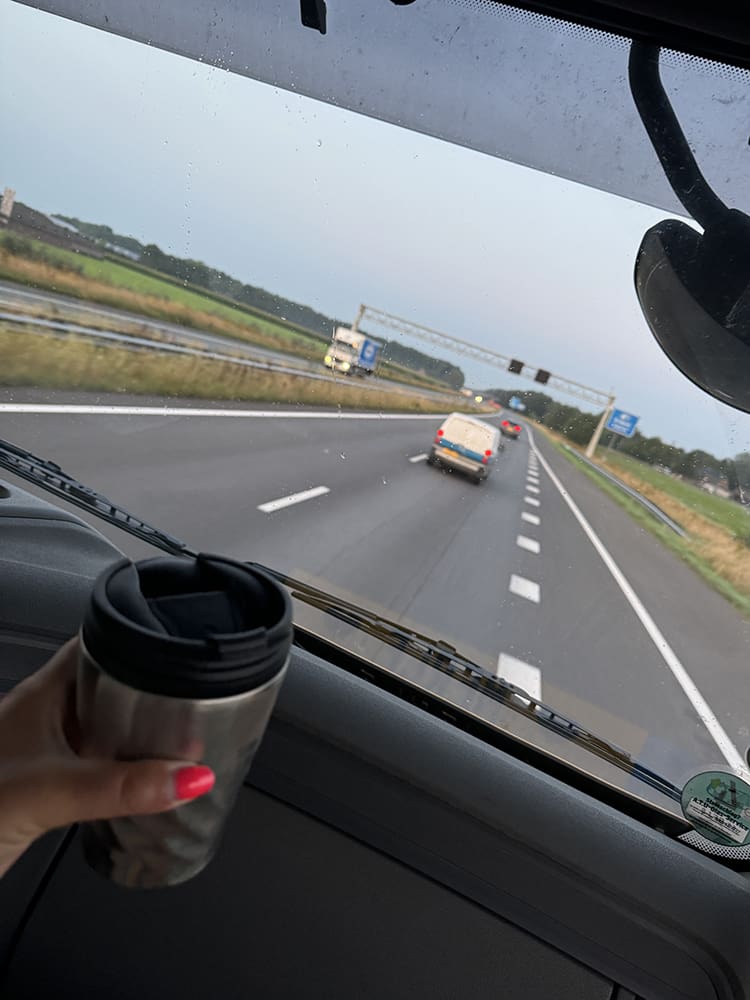 Maandag (19 augustus). Ik ging een dagje met Thijs mee op de vrachtwagen. Om half 6 ging de wekker. Phoe. Op de zaak koffie gehaald en gaan.