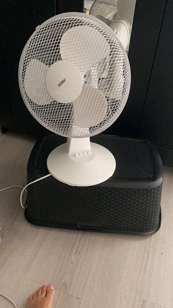 Vrijdag (18 juni). Een mooie constructie voor de ventilator. Gelukkig stond deze de volgende ochtend nog op de plek.