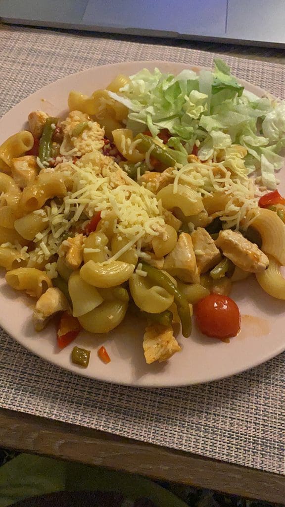 Jammie een pasta eten die Thijs voor mij had gemaakt. Lekker!