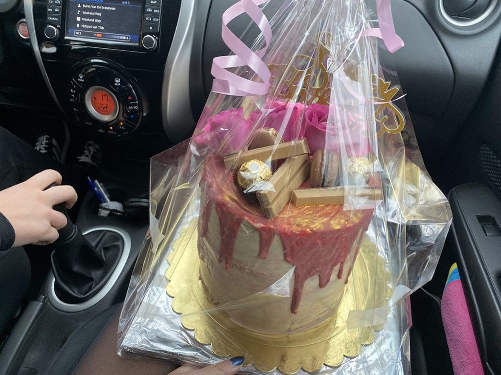 Zaterdag (21 november). Ik ben jarig! Jeej. Na mijn leuke verjaardagsoutfit aan gedaan te hebben, zijn Thijs en ik op pad gegaan. Mijn taart ophalen.