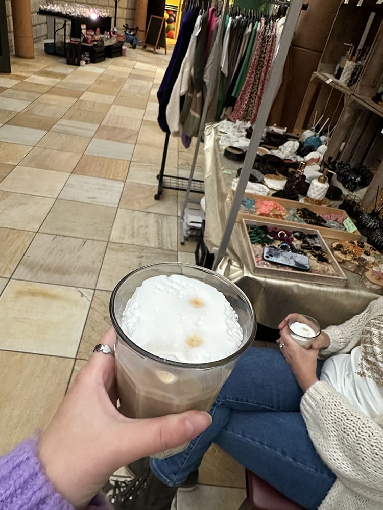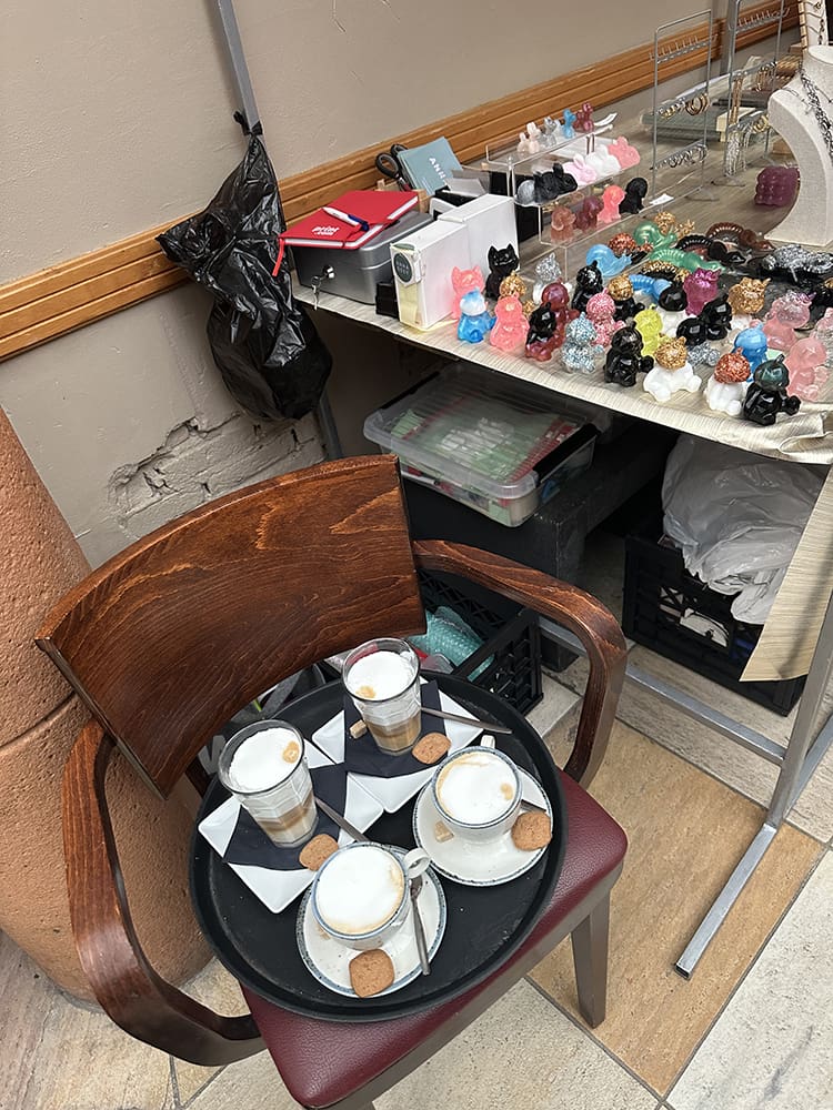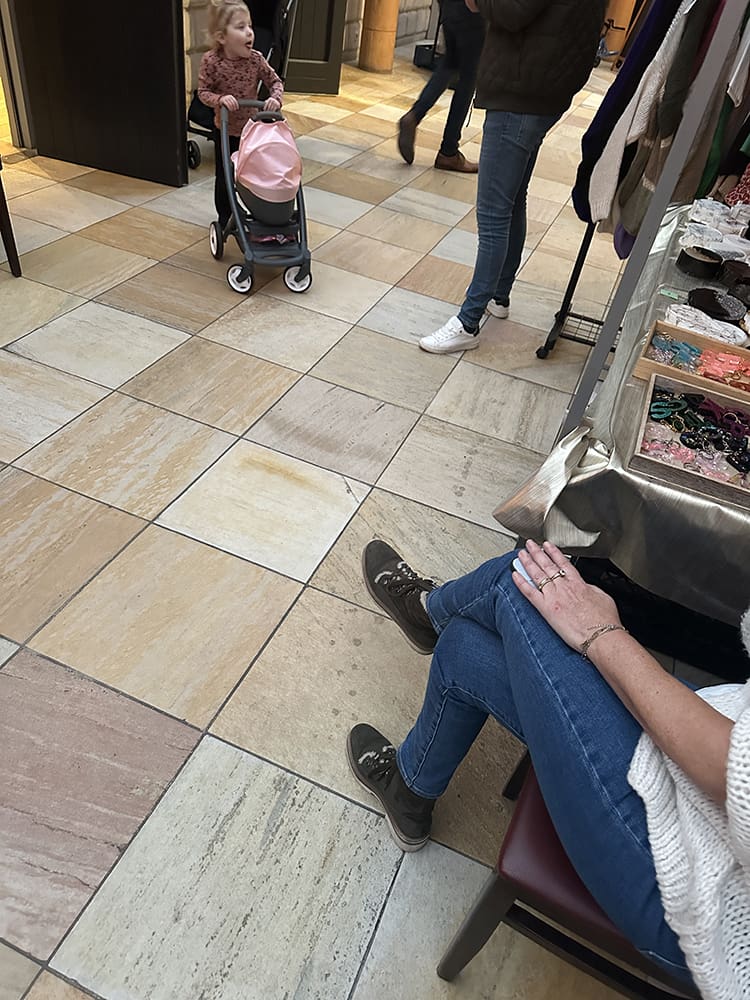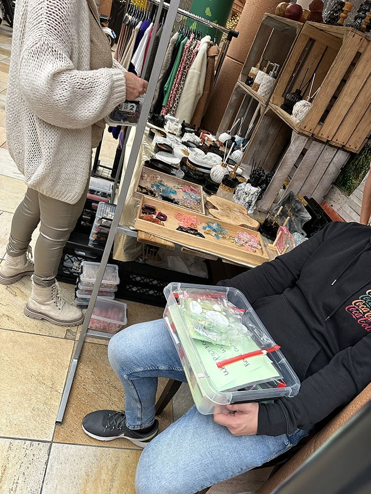 Tussendoor even lekker eten. Thijs was de andere kinderen van Rutjes wegbrengen. Ik vroeg aan Remco: pas jij even op onze kraam. Gaan moeders en ik eten. Het is toch niet druk. We waren nog geen 5 minuten weg of ik kreeg een appje: heb een set onderzetters verkocht, haha. Geniaal.