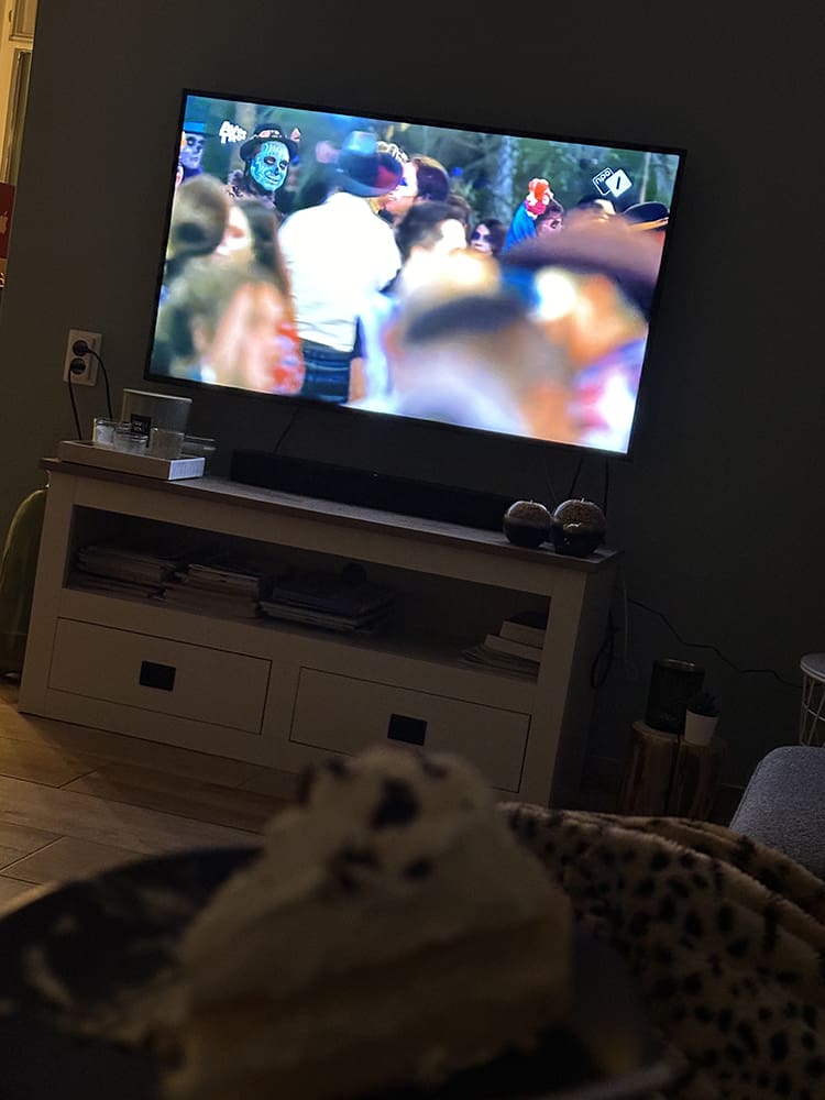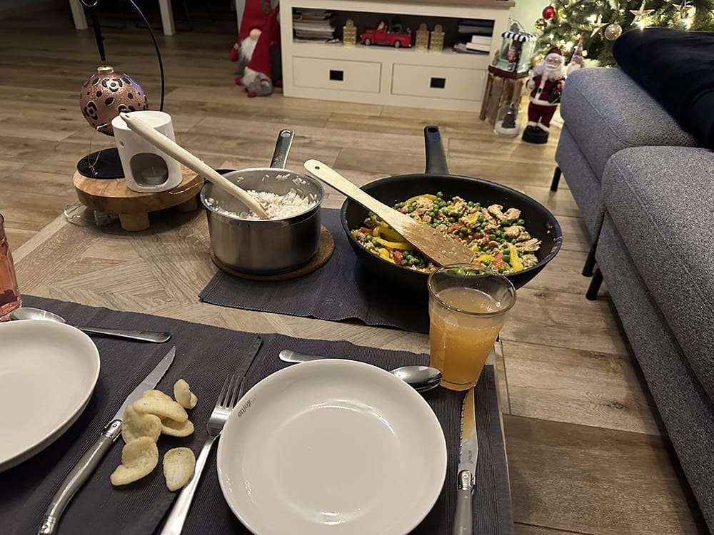 Thijs had een heerlijke rijstmaaltijd gemaakt. We keken de laatste aflevering van de Verhulsjes. We hebben echt hard gelachen.