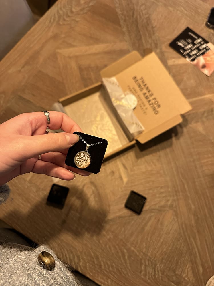 Toen ik thuis kwam, zag ik dat mijn ketting met vingerafdruk van opa er was. Zo mooi!