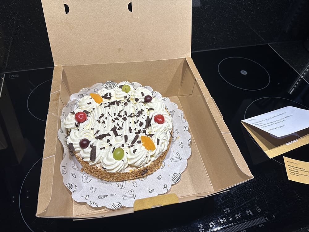 Zaterdag (6 januari). Ik ging sporten en ondertussen werd deze lekkere taart bezorgd. Thijs werkt vijf jaar bij Rabelink. Daarom kreeg hij deze lekkere taart. Die hebben we geproefd.