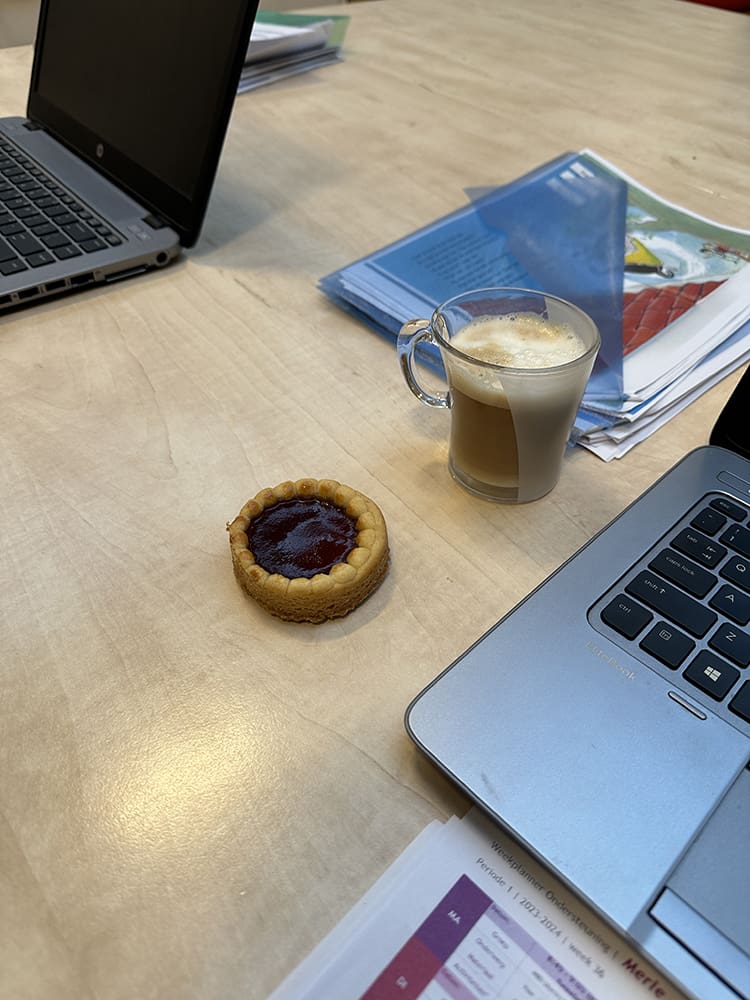 Maandag (8 januari). Daar zijn we weer op school. De kerstvakantie is voorbij en het werken op school start weer. Gelijk met een lekkere traktatie van een collega.